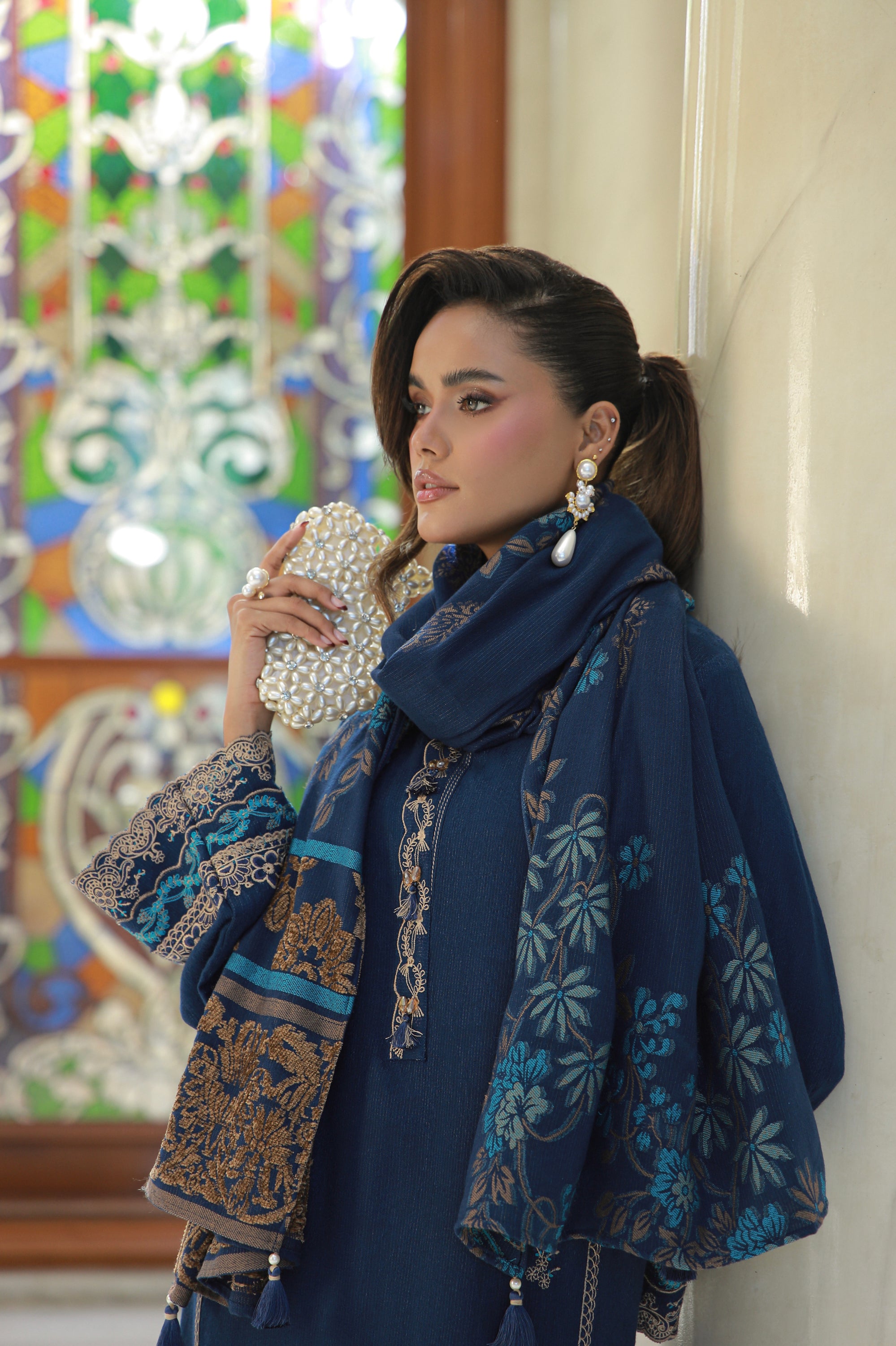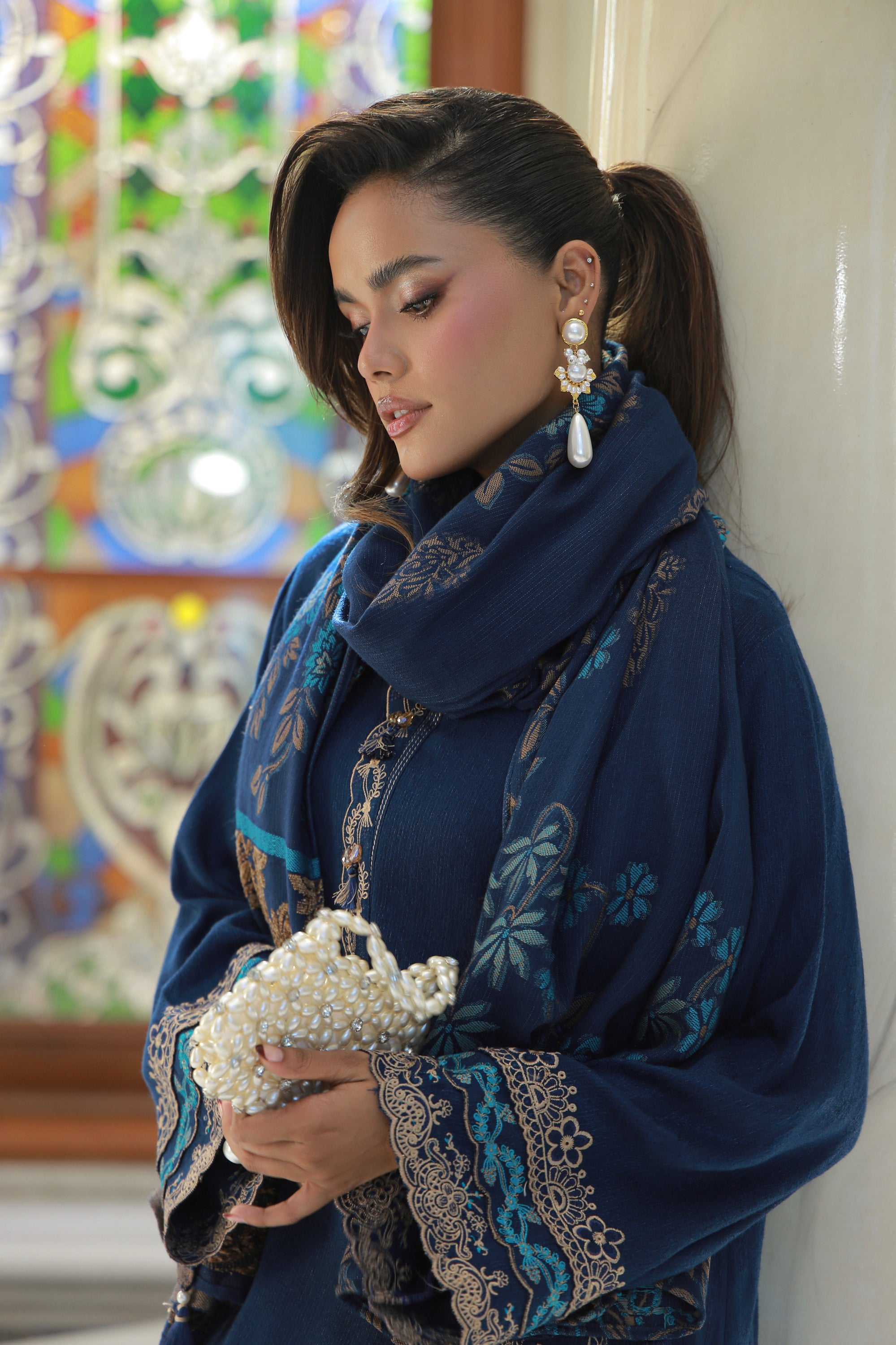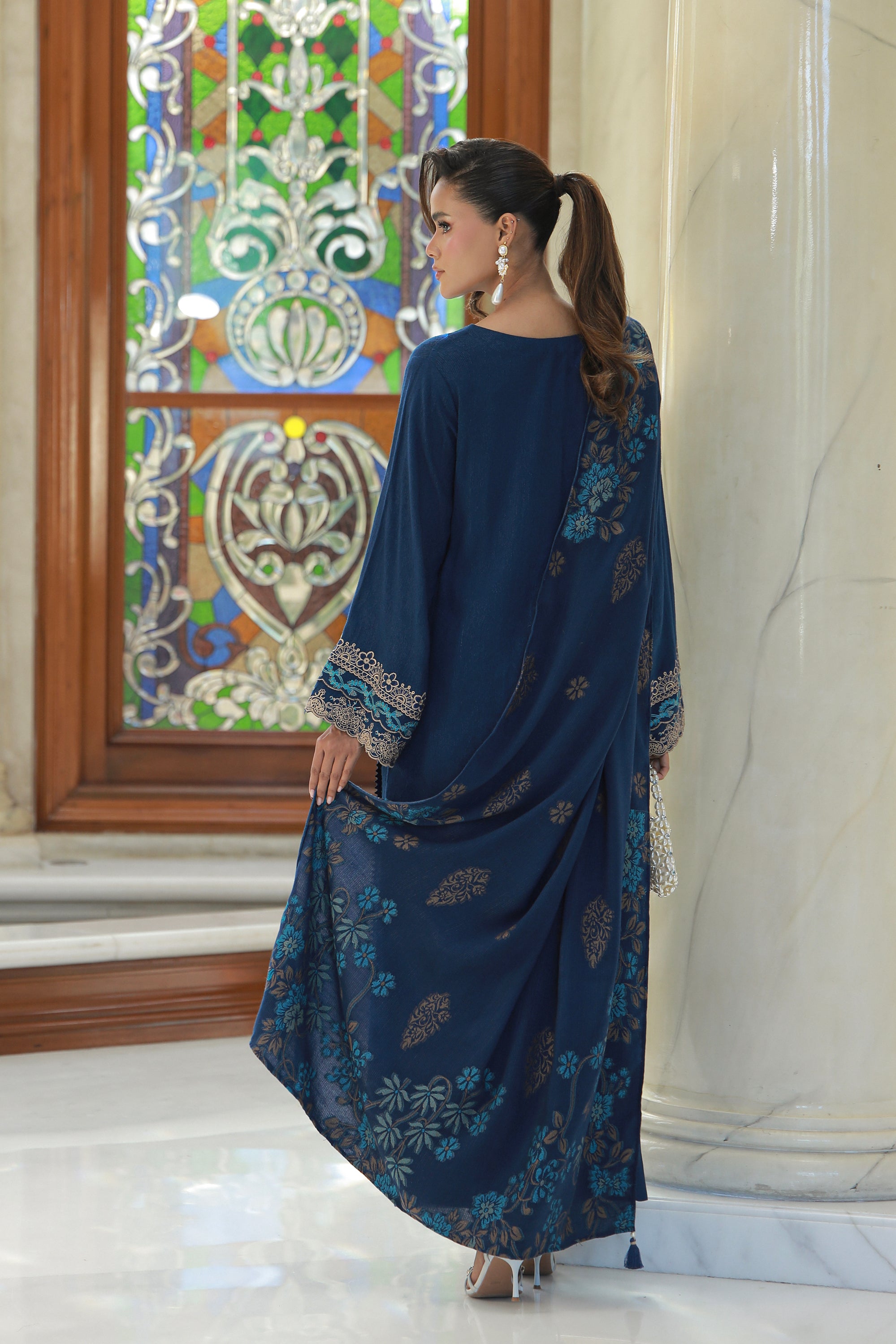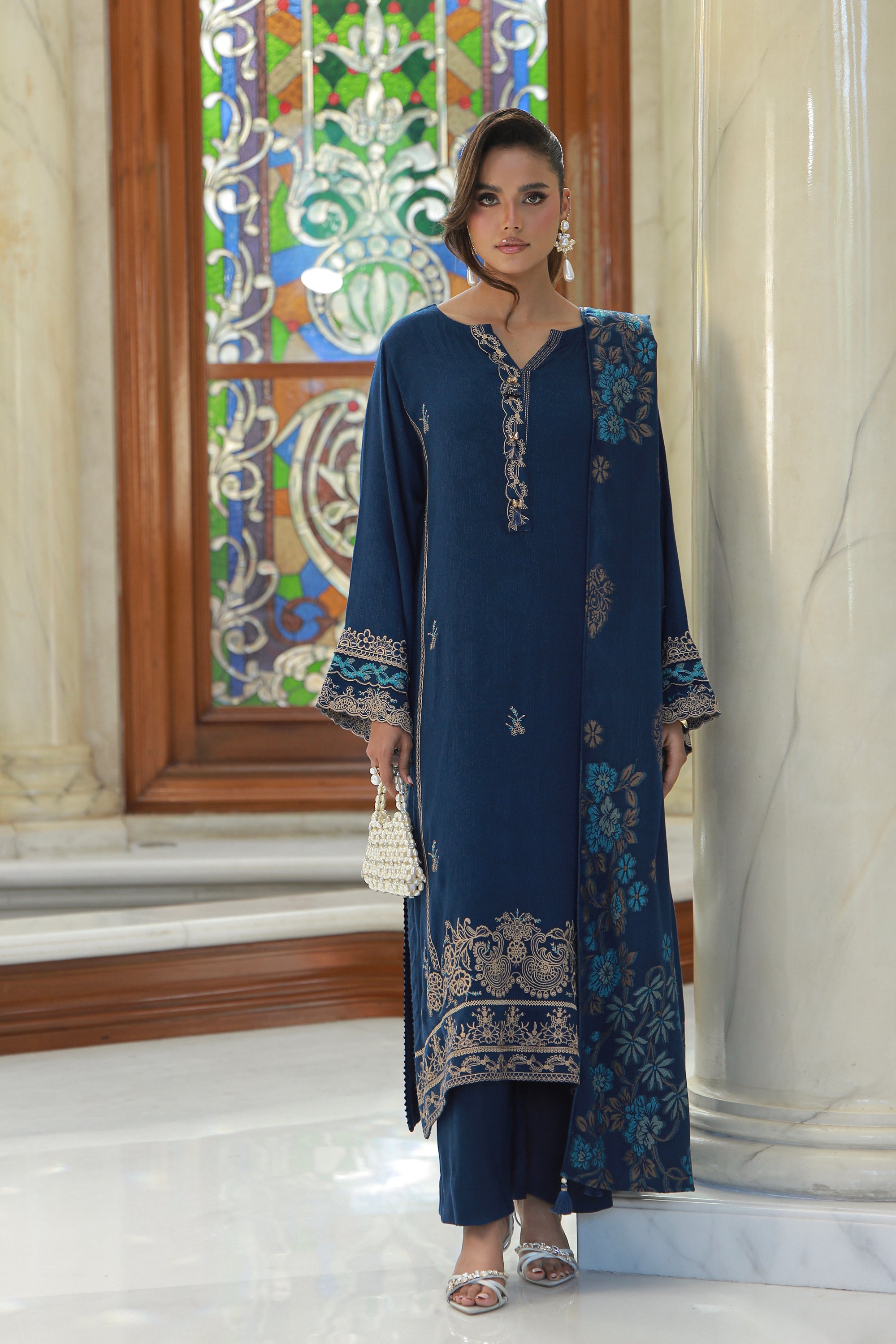03 Piece Stitched Embroidered Fancy Jacquard Peach With Velvet